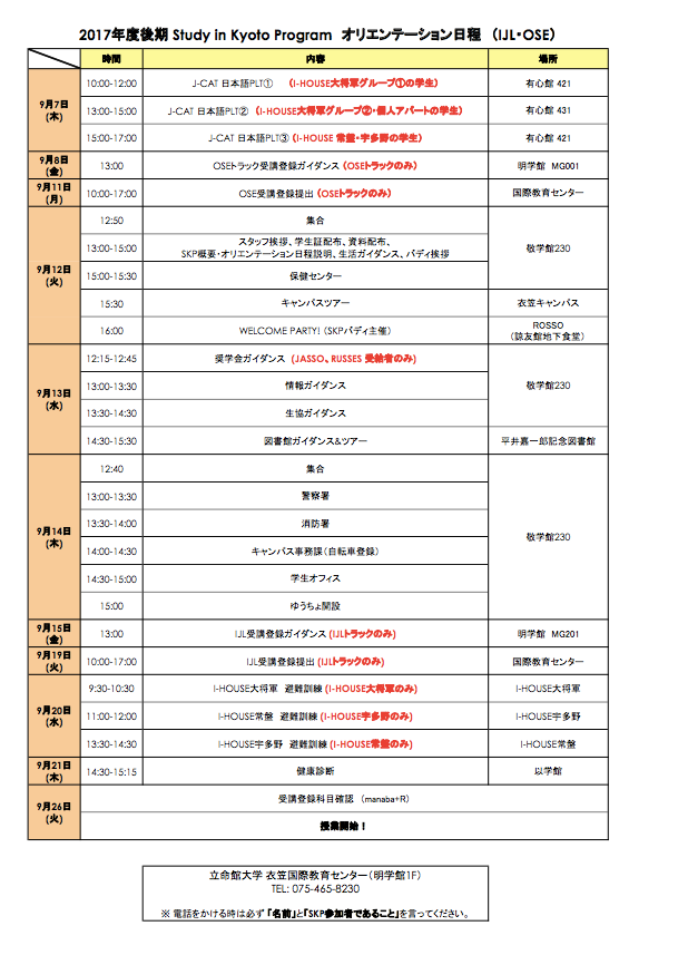 每個人都會收到一份中、英文版本的Orientaion,提醒我們要去參加。但這一份時程上並不一定是每一日都要參與的,我參加的交換課程是IJL(密集日本語課程),所以行程上面寫OSE的部份就自動跳過即可囉。